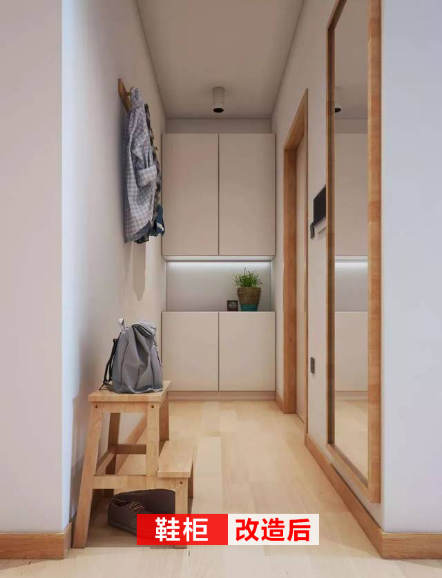 改造后的簡(jiǎn)潔清爽,和原來根本就是天差地別,干凈的白色到頂柜子,可以收納很多鞋子及其他物品,連換鞋凳和出門鏡都一一具備。