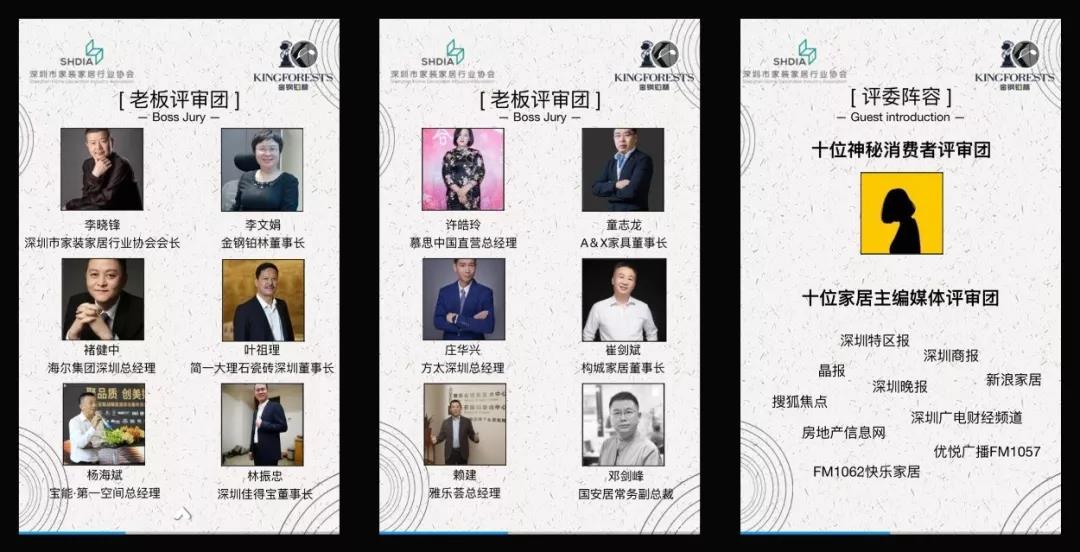 其中,由簡一大理石瓷磚、海爾卡薩帝、慕思寢具、A&X家具、方太電器、構(gòu)城定制、雅樂薈、寶能第一空間、國安居、佳得寶等家居行業(yè)知名品牌老總組成的老板評審團特別引人注目。組委會特別介紹,這些品牌在行業(yè)的影響力有目共睹,他們的認可是對設計能力與市場影響力不可置疑的肯定。
