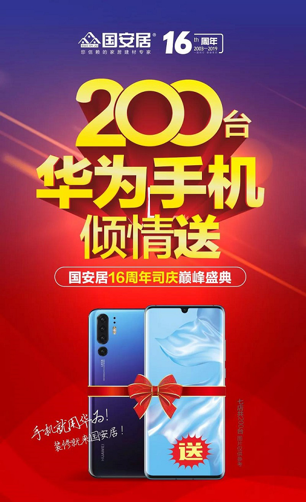 時(shí)光有限,堅(jiān)持無(wú)限,國(guó)安居16年里始終如一的堅(jiān)持做著一件事情:顧客至上,服務(wù)第一,誠(chéng)信為本!為回報(bào)廣大家居消費(fèi)者一直的厚愛(ài),國(guó)安居深惠七店在此16周年之際,攜手旗下1000余家一線大牌舉行“16周年司慶巔峰盛惠,200臺(tái)華為手機(jī)傾情送”大型促銷活動(dòng)。