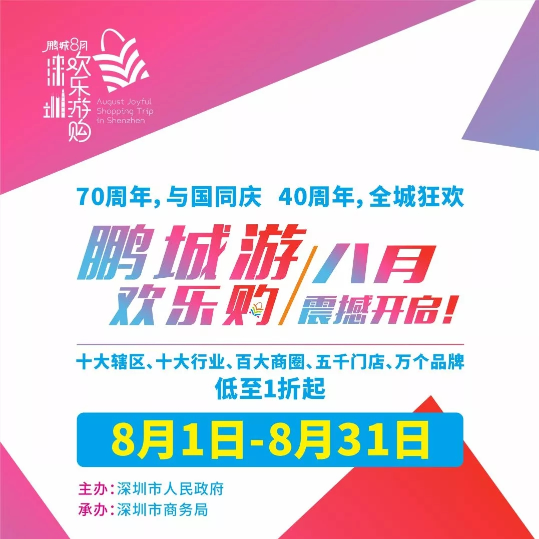 8月1,2019年“鵬城八月歡樂(lè)游購(gòu)”系列促消費(fèi)活動(dòng)正式拉開(kāi)帷幕,活動(dòng)以“鵬城游·歡樂(lè)購(gòu)”“深圳let’s購(gòu)”“深圳不限購(gòu)”“樂(lè)享盛夏·歡購(gòu)鵬城”等為口號(hào),整個(gè)8月將在全市營(yíng)造“天天有優(yōu)惠、周周有活動(dòng)、行行促消費(fèi)、區(qū)區(qū)有特色”的氛圍。搶抓中央打造粵港澳大灣區(qū)和大力發(fā)揮消費(fèi)基礎(chǔ)性作用的雙重機(jī)遇,以激發(fā)居民消費(fèi)潛力為目的,以舉辦大型促消費(fèi)活動(dòng)為手段,以開(kāi)展大規(guī)模宣傳造勢(shì)為驅(qū)動(dòng),推廣宣傳深圳制造、深圳品牌和深圳設(shè)計(jì),結(jié)合暑期消費(fèi)熱點(diǎn),發(fā)揮濱海旅游資源優(yōu)勢(shì),吸引國(guó)內(nèi)外最具活力和消費(fèi)力的年輕人群齊聚深圳,共同享受夏日的購(gòu)物狂歡盛宴。此外,以本次活動(dòng)為起點(diǎn),從2019年開(kāi)始,深圳市將在每年8月作為“鵬城歡樂(lè)游購(gòu)”月定期舉辦。通過(guò)3-5年的持續(xù)打造,力爭(zhēng)將其辦成規(guī)模最大、影響力最強(qiáng)、知名度最高的國(guó)內(nèi)一流的促消費(fèi)活動(dòng),成為深圳城市的一張靚麗名片。