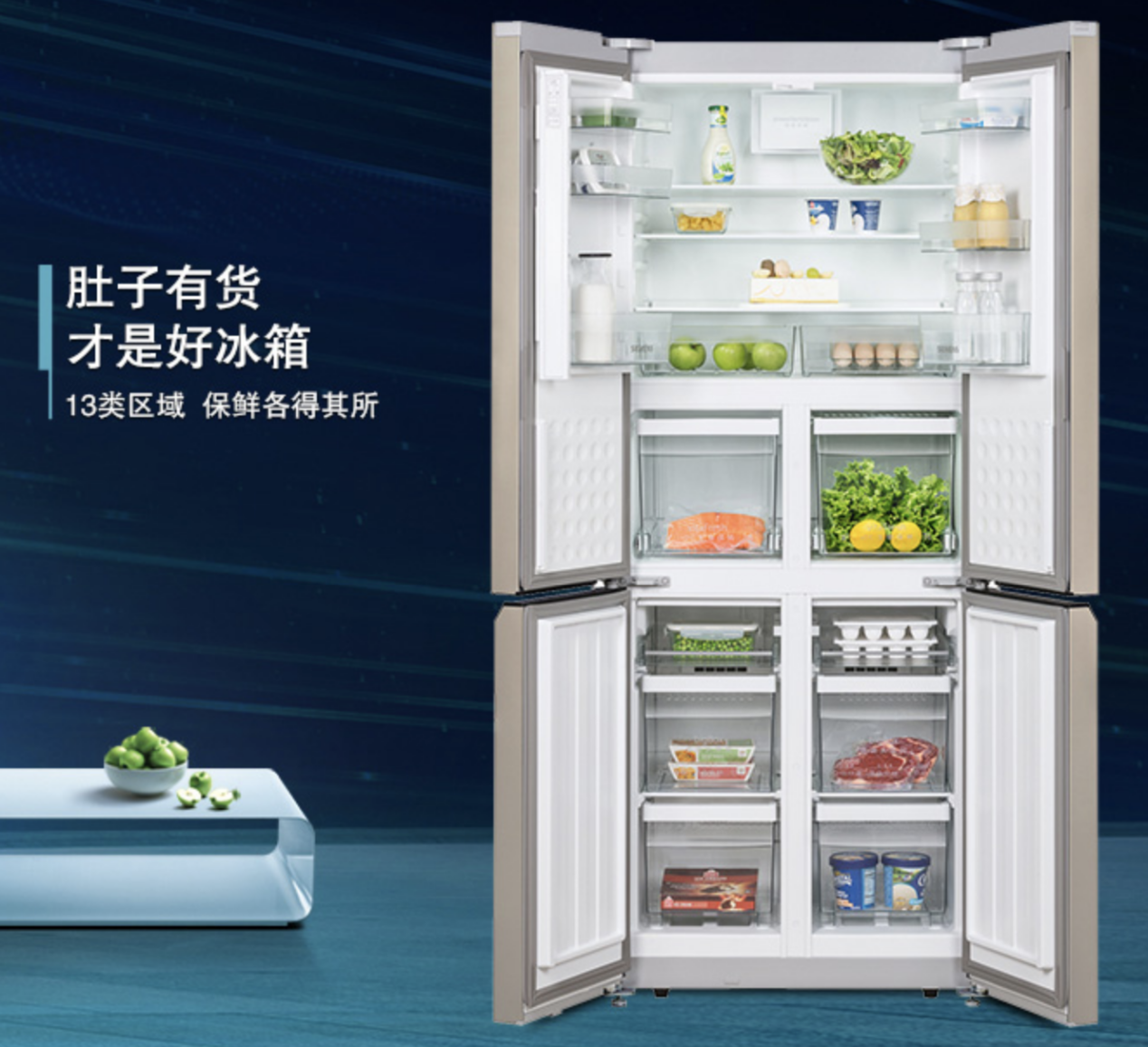 西門子KM46FA30TI采用十字對(duì)開門設(shè)計(jì),不僅簡(jiǎn)約美觀,容積更是達(dá)到了452升,13類區(qū)域設(shè)置,讓每份食物都各得其所,滿足了家庭更多的儲(chǔ)存需求?;炖潆p動(dòng)力、風(fēng)冷無霜、零度保鮮,可以讓蔬菜水果保持新鮮水嫩,也可以讓魚、肉營(yíng)養(yǎng)不流失,鮮嫩如常。LCD顯示+觸摸控制,嵌入式門把手,閉門系統(tǒng),它不妥協(xié)任何細(xì)節(jié),盡顯人們生活品味。
