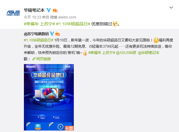 1月10日,今年的蘇寧易購華碩超品日將再次啟動(dòng),1月3日正式進(jìn)入預(yù)熱階段,今天早上蘇寧電腦數(shù)碼官微賬號(hào),發(fā)布了今年華碩超級(jí)品牌日活動(dòng)的正式信息,華碩官方賬號(hào)也第一時(shí)間與之進(jìn)行了回應(yīng)互動(dòng)。