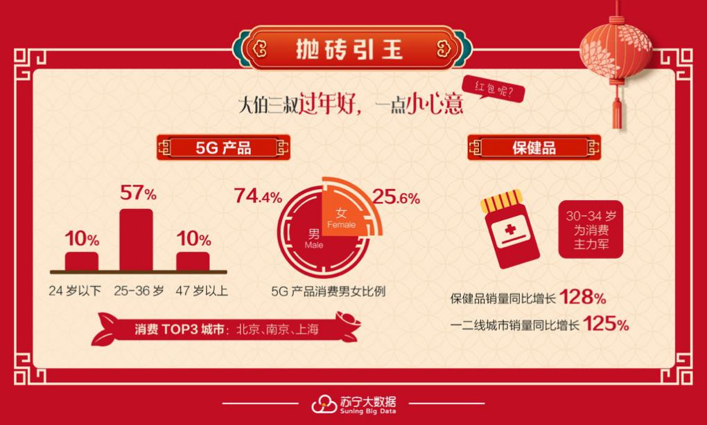 近年來(lái),最受寵的春節(jié)禮品從食品服飾漸漸過(guò)渡到了健康類(lèi)產(chǎn)品。蘇寧消費(fèi)報(bào)告顯示,春節(jié)保健品銷(xiāo)量同比增長(zhǎng)128%,一二線城市銷(xiāo)量同比增125%,購(gòu)買(mǎi)者以30-34年齡段的“家庭主心骨”為主,希望家人身體健康大概是每個(gè)人最樸實(shí)的新年愿望。