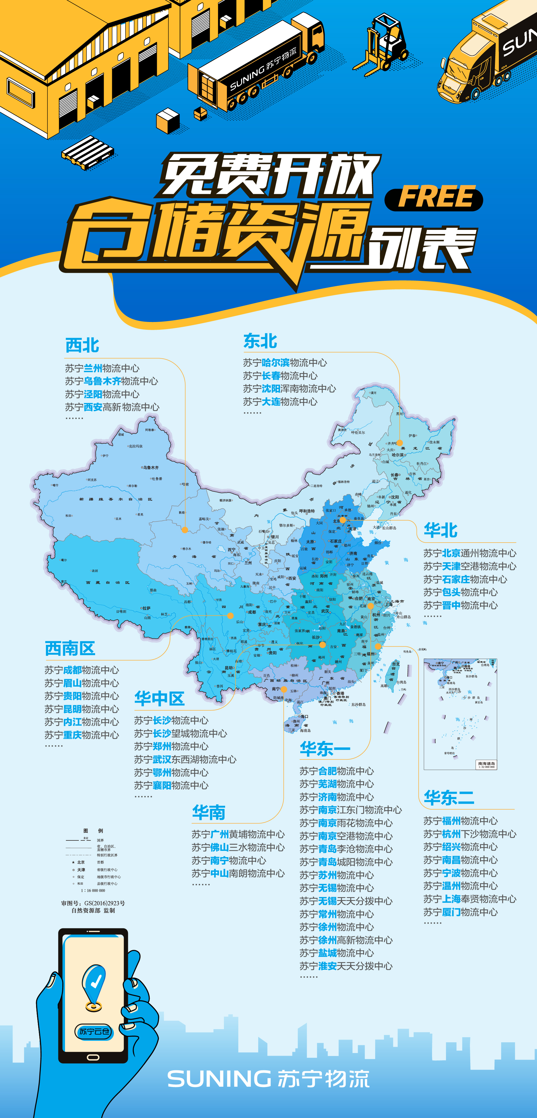 本次免費倉儲資源涉及蘇寧物流全國100+物流中心,涵蓋北京、上海、廣州、南京、成都、武漢、沈陽、西安、天津、溫州、長沙、中山、佛山、徐州、青島、哈爾濱等城市,可滿足全國絕大多數(shù)地區(qū)的相關(guān)需求。