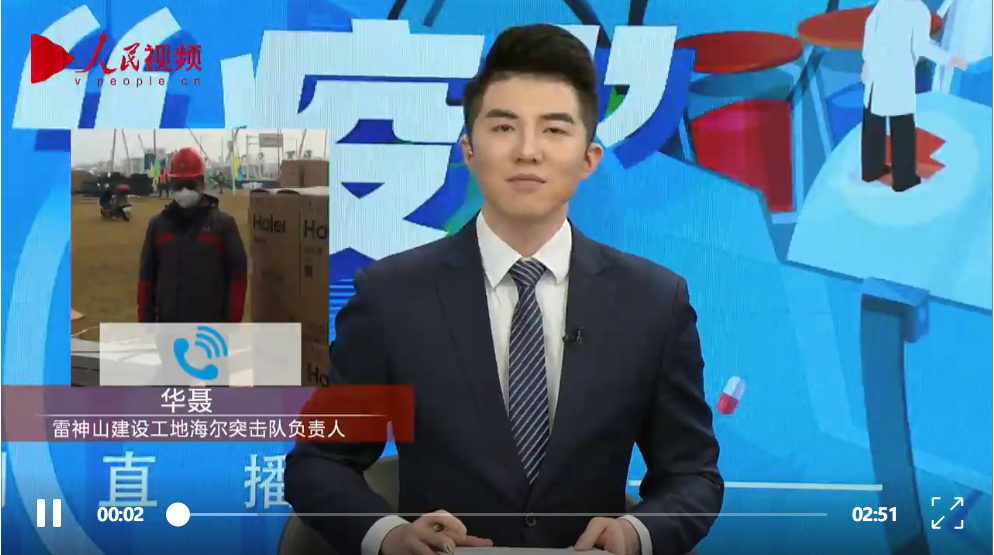 在連線中,海爾突擊隊現(xiàn)場負(fù)責(zé)人華聶說,疫情發(fā)生以后,聽到雷神山醫(yī)院要成立海爾突擊隊,很多人都自愿放棄休假,紛紛報名,他們有來自各地的春節(jié)期間值班人員,也有家住本地的服務(wù)人員。大家第一時間來到雷神山醫(yī)院建設(shè)現(xiàn)場,支援醫(yī)院建設(shè)。