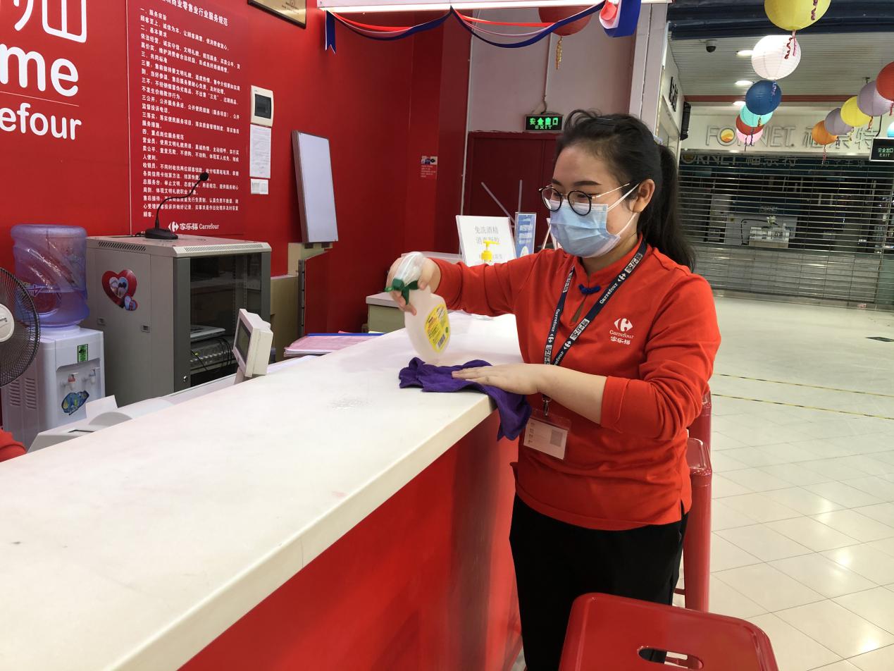 陳翠姣這次被分配到了超市收銀部門,由于是標(biāo)準(zhǔn)化操作,加上使用移動(dòng)支付的顧客較多,技術(shù)難度不大,在資深員工的耐心指導(dǎo)下,她上手很快。陳翠姣表示對(duì)新崗位很滿意,她說,賦閑在家太久了,這次能換崗上任,很開心,“尤其是能夠加入到保障城市民生供應(yīng)的大型商超,非常有意義?!毕挛?點(diǎn),陳翠姣為服務(wù)中心柜臺(tái)做第三次消毒清潔后,便可以結(jié)束今日的早班工作,打卡下班了。