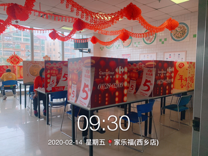 蘇寧家樂福還安排了保潔員每天對(duì)員工餐廳按三餐進(jìn)行清潔,使用稀釋的84消毒液浸泡抹布對(duì)桌椅進(jìn)行擦拭。其次,在餐廳放置免洗消毒凝膠,供員工用餐前清潔使用。再次,要求員工分時(shí)段用餐,自帶餐盒餐具盛飯;每個(gè)人在餐廳內(nèi)用餐是也要與他人保持一定距離,并用簡易卡板隔開。