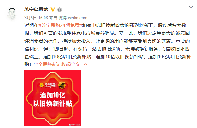 繼官宣24期免息政策后,蘇寧侯恩龍3月5日再發(fā)聲,微博表示將在315節(jié)點重磅加碼以舊換新業(yè)務(wù),“即日起,在保持一站式以舊換新、無接觸換新服務(wù)、3倍收舊補(bǔ)貼基礎(chǔ)上,追加10億以舊換新補(bǔ)貼”。