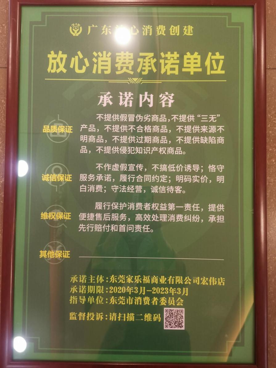 家樂(lè)福根據(jù)《經(jīng)營(yíng)者“放心消費(fèi)承諾”活動(dòng)規(guī)則(試行)》向社會(huì)公開作出品質(zhì)保證、誠(chéng)信保證和維權(quán)保證的“三大承諾”,承諾不提供假冒偽劣商品,不提供“三無(wú)”產(chǎn)品;不作虛假宣傳;履行保護(hù)消費(fèi)者權(quán)益第一責(zé)任等,充分發(fā)揮放心消費(fèi)承諾單位示范作用,深入推進(jìn)放心消費(fèi)創(chuàng)建活動(dòng),深化消費(fèi)維權(quán)社會(huì)協(xié)同共治,營(yíng)造安全放心的消費(fèi)環(huán)境。