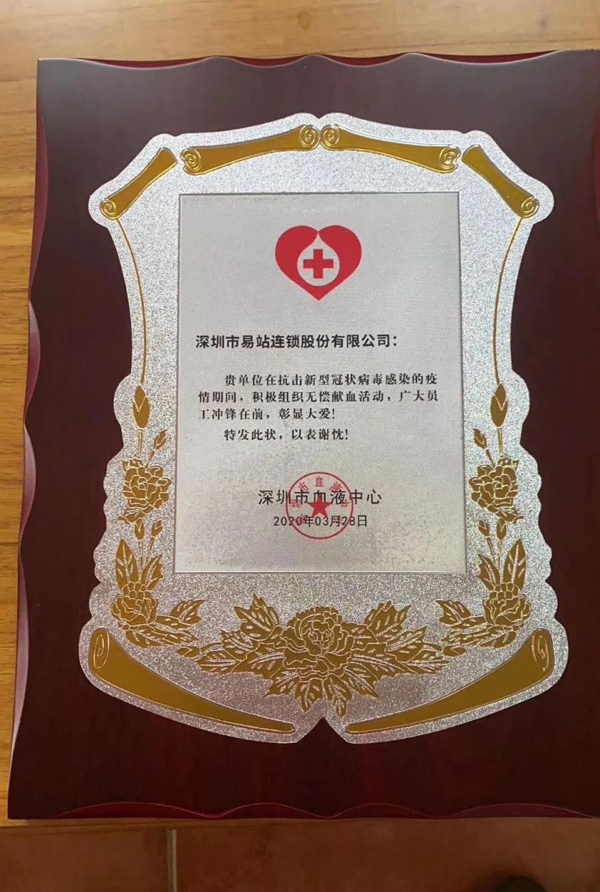 在得知站友們?nèi)绱朔e極熱情的參與獻血后,深圳市血液中心特地向易站連鎖頒布了感謝牌。