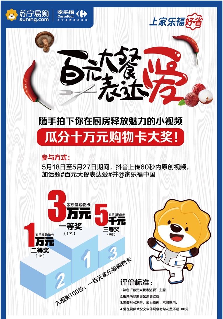 近期陳老伯和女兒聊的最多的除了做菜,還有父女倆都很期待的一場比賽。據(jù)悉,5月18日至6月18日,家樂福將舉辦一場主題為“百元大餐表達(dá)愛”的鄰家大廚視頻PK賽,鼓勵(lì)參賽者做道有故事的菜,向摯愛的人表達(dá)濃濃的情意。你負(fù)責(zé)做菜,家樂福負(fù)責(zé)買單。你無需具備可媲美專業(yè)廚師的高超技藝,僅需擁有一顆熱愛美食的心和一雙巧手,無論是國人經(jīng)典標(biāo)配的“四菜一湯”,抑或是最適合情侶的西式浪漫—牛扒配紅酒,隨你發(fā)揮。以百元預(yù)算準(zhǔn)備食材,將烹調(diào)過程上傳抖音。屆時(shí),突圍選手將有機(jī)會瓜分價(jià)值十萬元的購物卡大獎(jiǎng)。