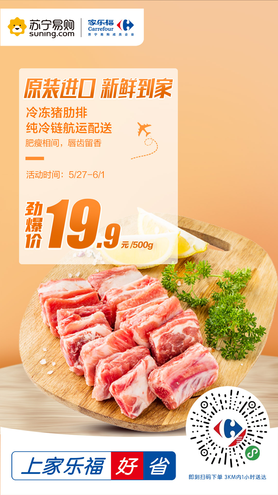 進(jìn)口冷凍豬肋排是本次活動的主推爆品之一。生豬按照歐盟標(biāo)準(zhǔn)養(yǎng)殖,采用非轉(zhuǎn)基因飼料喂養(yǎng),全程不使用抗生素,原廠精切,采用純冷鏈航運(yùn)配送,全程可溯源。肥瘦相間,讓人唇齒留香。豬肉價格高企的背景下,這款進(jìn)口豬肋排原價39.9元/500g,活動期間僅售19.9元/500g,價格十分惠民,絕對是秒殺爆品。此外,家樂福還準(zhǔn)備了澳洲黃牛肉36.8元/斤、帶皮后腿肉19.9元/斤、小龍蝦19.9元/盒、波士頓龍蝦+三文魚的組合預(yù)售。誠意滿滿,只為滿足“食肉獸”的大胃口!