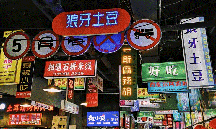 負(fù)一樓超市外yes街,統(tǒng)一的燈光亮化,霓虹夜市街景搭配美味食物,遇上“饑腸轆轆”的人群,擦出“狼吞虎咽”的火花。美食是繁榮夜市的永恒主題,品類多樣,飄香四溢,定被“吃貨”們喜愛(ài)。