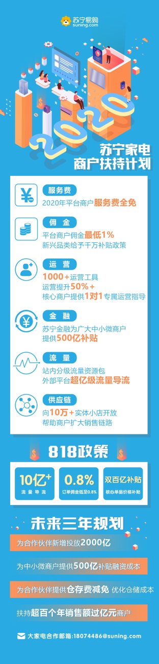 蘇寧宣布,2020年蘇寧將免收平臺商戶服務(wù)費;向中小微商戶提供500億補貼融資成本,幫助商戶緩解資金壓力;平臺上的商品供應(yīng)鏈會向蘇寧生態(tài)中10萬+實體小店開放,幫助商戶擴大銷售通路。同時,大家電行業(yè)線將持續(xù)給平臺商戶匹配站內(nèi)外的億級流量,并通過星河生態(tài)賦能平臺開放1000+運營工具,針對核心商戶提供1對1專屬運營指導(dǎo),借此幫助商戶有效提升經(jīng)營效率,降低運營成本。