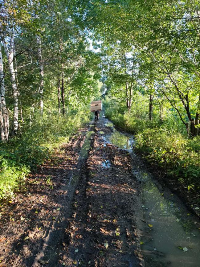 一路開(kāi)下來(lái),車身濺起不少泥垢??斓侥康牡貢r(shí),一段泥濘的林間小路攔住了王能的去路。原來(lái),道路積水過(guò)多,泥土過(guò)軟,車輛不能前行。王能隨即將車停靠在路邊,直接卷上褲腿,扛起電視前行。兩公里的林間路,本就不輕松,扛著電視更是“難上加難”。