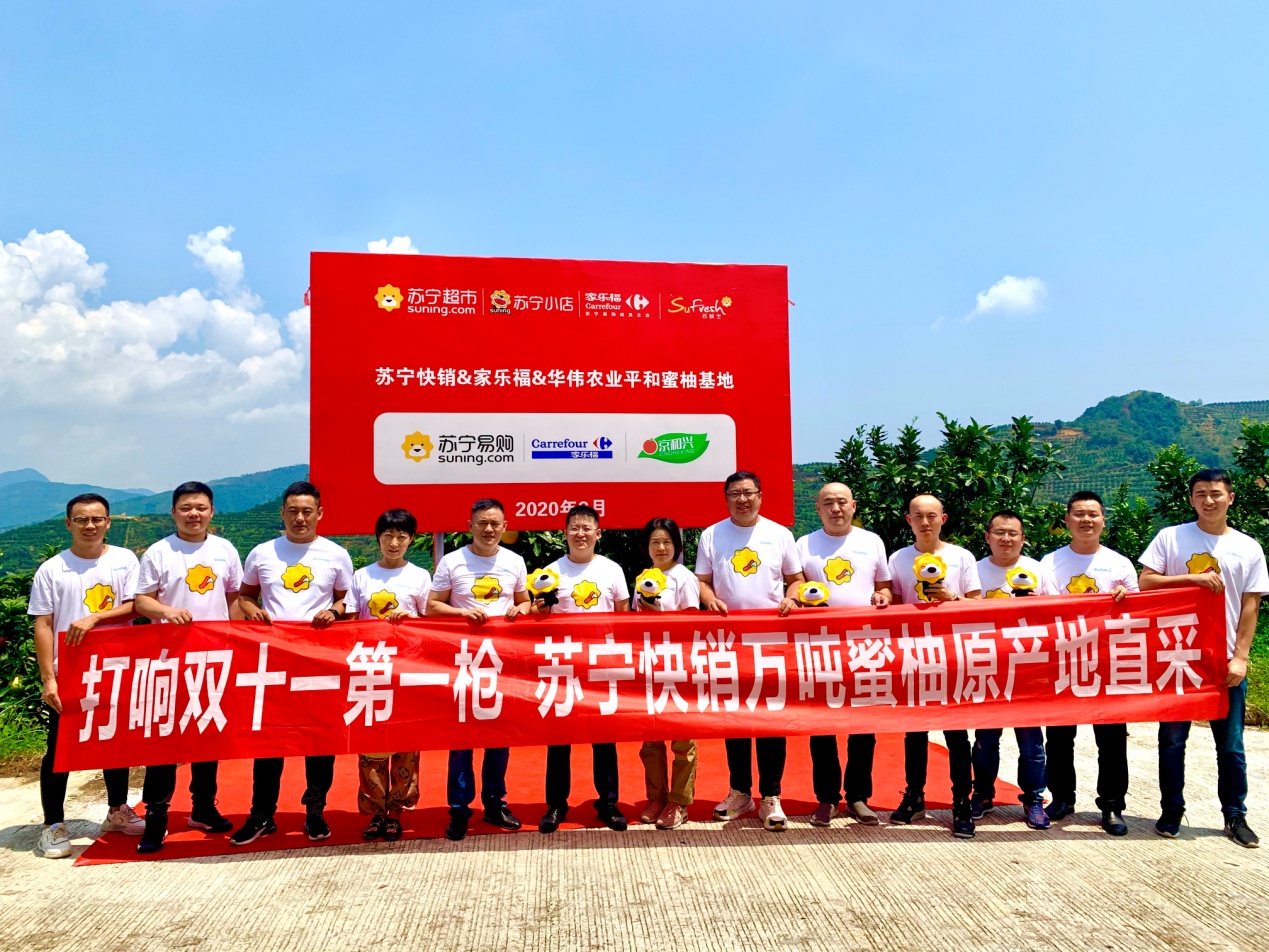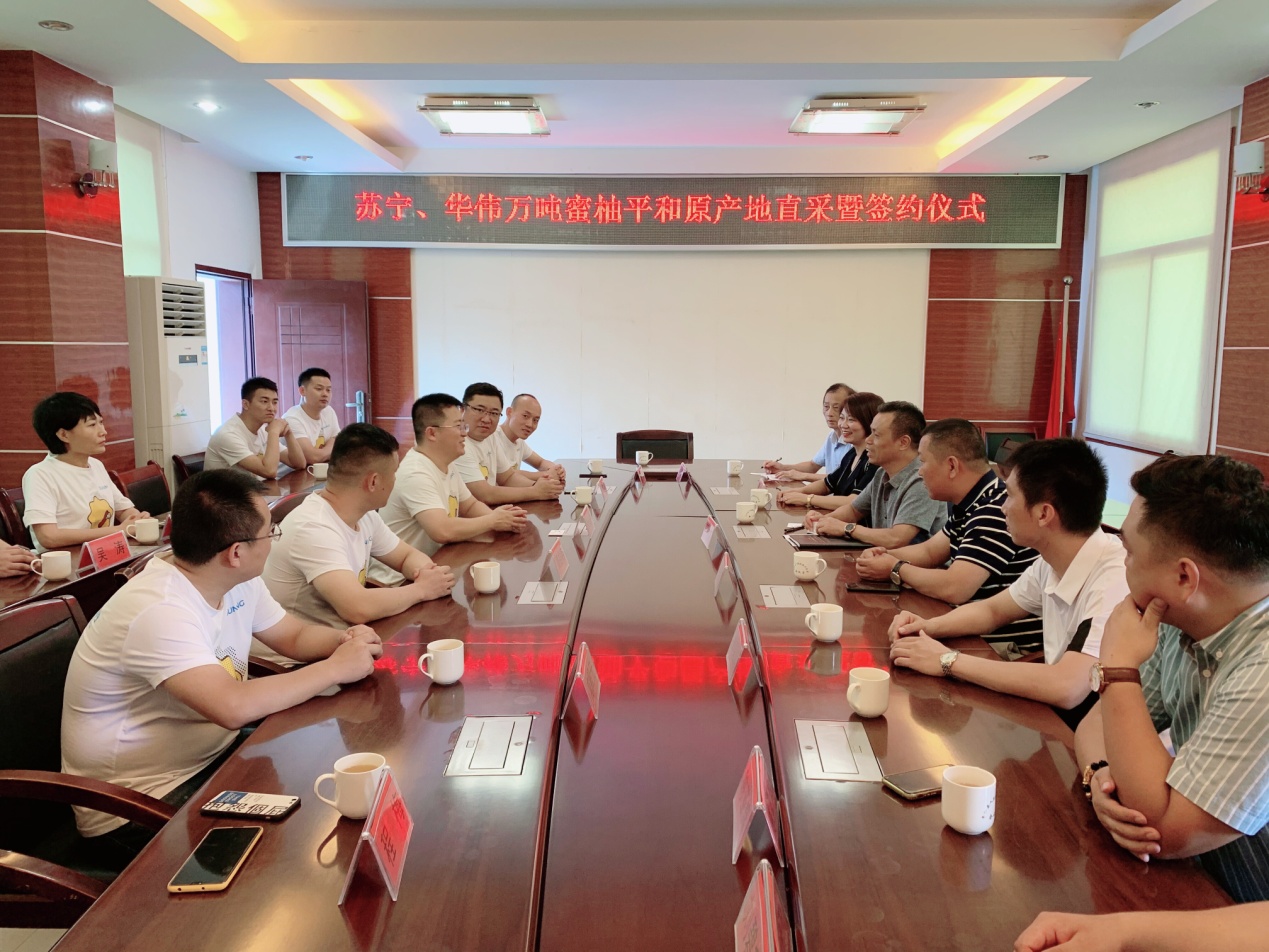 8月26日,蘇寧家樂福中國(guó)區(qū)生鮮采購(gòu)總監(jiān)孫樂超、水果組總監(jiān)孟碩、華南區(qū)采購(gòu)總監(jiān)周益明,以及蘇寧易購(gòu)水果組采銷總監(jiān)戴躍等一行來到位于福建省平和縣的華偉農(nóng)業(yè)蜜柚基地,與平和縣委書記郭德志等地方領(lǐng)導(dǎo)共同宣布蘇寧家樂福&華偉農(nóng)業(yè)蜜柚直采基地的正式啟動(dòng)。