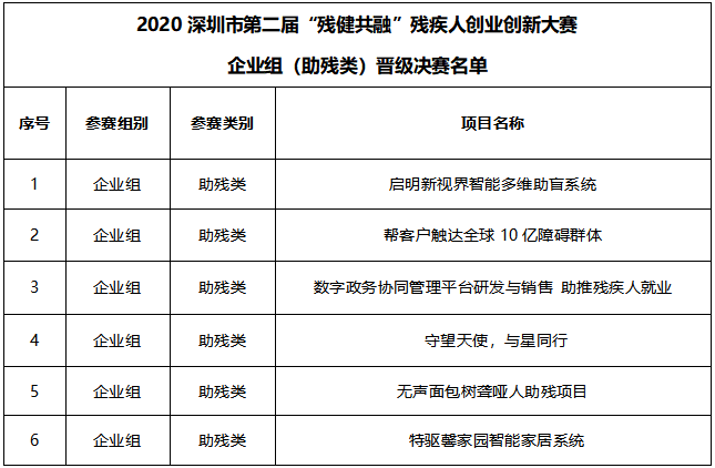 2020深圳市第二屆“殘健共融”殘疾人創(chuàng)業(yè)創(chuàng)新大賽企業(yè)組(自強類)晉級決賽名單