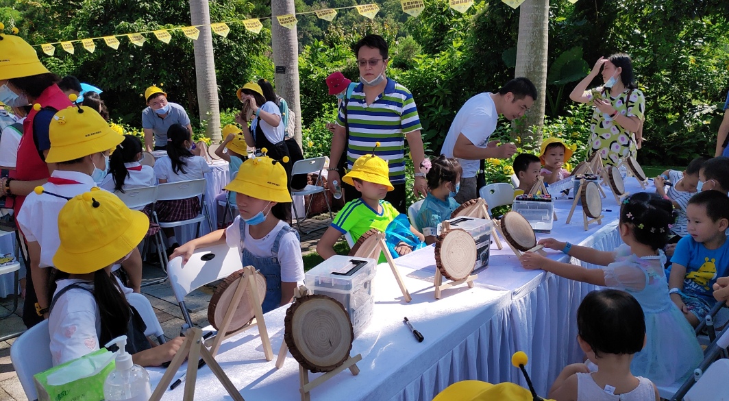 在繪畫活動(dòng)區(qū),家長(zhǎng)和孩子們就像一個(gè)個(gè)蜜蜂家庭,既分工明確,又互相協(xié)作,孩子們充分發(fā)揮自己的想象,在陶瓷罐、圓木片、蜂箱上繪出心目中最美的圖畫!孩子們興高采烈的說(shuō):原來(lái)蜜蜂不僅僅是采花釀蜜,還與人類生活密切相關(guān)!希望爸爸媽媽和我一起畫出來(lái)的圖畫,能吸引到真的蜜蜂來(lái)入住!想深入了解蜜蜂知識(shí)的朋友,可以于9月12日當(dāng)晚,在B站視頻媒體上與西澳蜜蜂專家進(jìn)行國(guó)際連線,共同探討蜜蜂的秘密。
