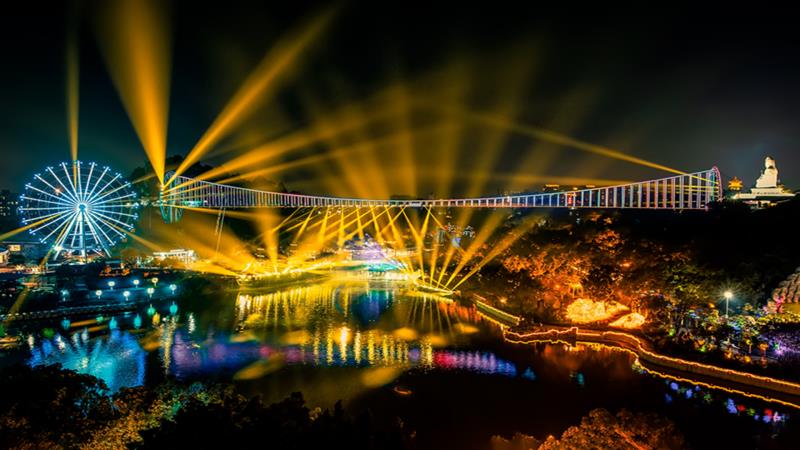 2021年是農(nóng)歷丑牛年,隱賢山莊特別推出了“與牛共舞”和小丑互動節(jié)目,景區(qū)選取了傳統(tǒng)文化里具有勤勞實干品質(zhì)的“?!睘殚_年使者,讓大家與可愛的萌牛共舞,再配上幽默搞笑的小丑與游客互動,貼合“丑?!钡男履曛黝}。“魔幻孔雀谷”是以孔雀谷的多彩靜謐的環(huán)境為背景,由國內(nèi)知名魔術(shù)師現(xiàn)場表演近景魔術(shù),比熒幕觀賞更有逼真和神秘的效果?!帮L(fēng)情加勒比”將在加勒比民族舞臺上演云南佤族特色舞蹈,讓東莞游客不出遠(yuǎn)門就能體驗到異域風(fēng)情?!拌仓埂笔窃陔[賢山莊的網(wǎng)紅橋——3D玻璃橋演繹瀑布燈光秀,空中七彩燈光閃耀,與隱賢湖水交相輝映,猶如置身唯美的天上街市?!谤o橋浪漫”是隱賢山莊專門為有情人預(yù)備的一份節(jié)日禮物,在喜鵲的簇?fù)砗鸵魳返陌樽嘞?,他們從鵲橋的兩端緩緩走向?qū)Ψ?,將中華民族流傳千年的牛女相會的愛情故事由神話變成現(xiàn)實。