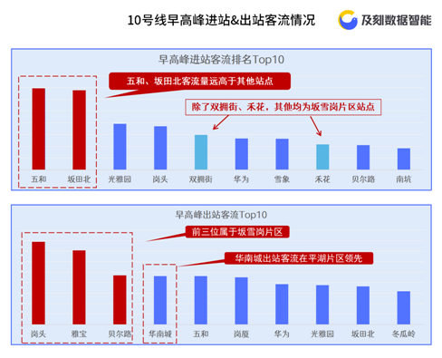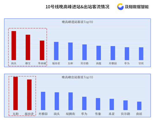 早高峰(6-10點)進站客流Top10站點中,坂雪崗片區(qū)占據(jù)8席,反映其周邊區(qū)域聚居著眾多的上班族。其中,五和、坂田北進站客流遙遙領(lǐng)先其他站點。