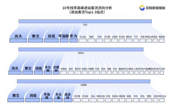 晚高峰(18-20點)進站客流,崗頭、雅寶、華南城位居前三位,印證其客流主力為上班族。