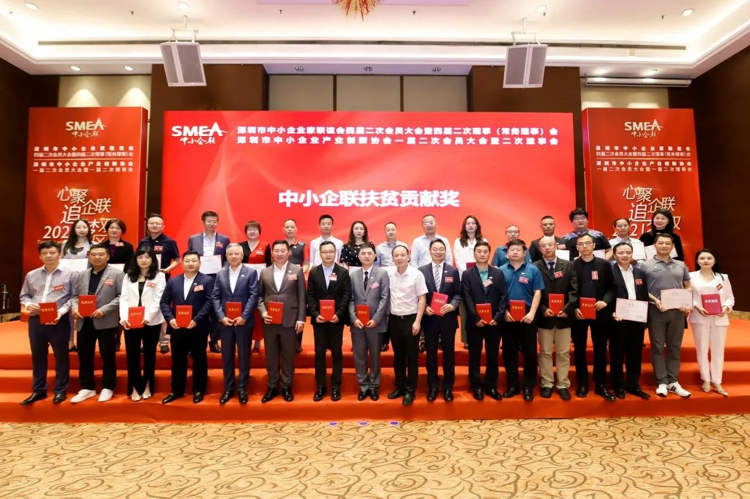 深圳市中小企業(yè)服務(wù)局副局長陳小林(左九)為獲得扶貧貢獻(xiàn)獎的企業(yè)家頒獎