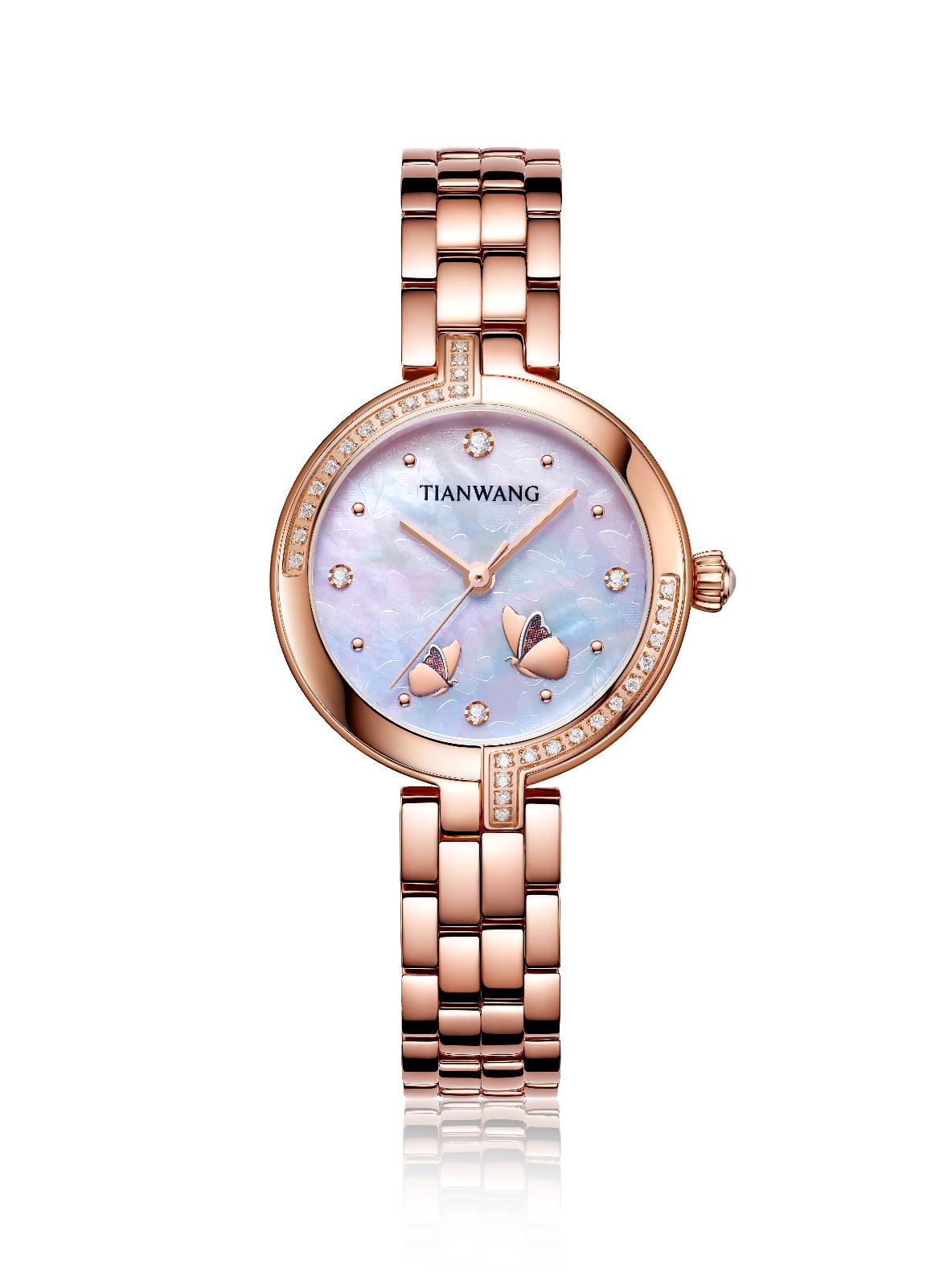 這次合作的腕表,沿襲了天王表的精品品質(zhì)和設計美學,有點“小確幸”的風格,整體很秀氣但是細節(jié)都誠意滿滿。表是蝴蝶的天空,指針是蝴蝶的舞步。表盤采用蝴蝶壓印貝母,在藍寶石玻璃表鏡下,兩只立體蝴蝶翩然起舞,人如蝴蝶,蝴蝶像人,都迷戀這花花世界,想要縱情暢游其中。腕表刻度和表圈由璀璨皓石點綴,3點、6點、9點、12點使用較大皓石,使得整個表盤錯落有致,富有層次感。搭配夢幻南瓜把的,極具浪漫色彩。玫瑰金色不銹鋼表殼,給人以優(yōu)雅炫目之感,質(zhì)感鋼帶,光澤度明亮,搭配不銹鋼蝴蝶扣,錦上添花,佩戴效果自然舒適。
