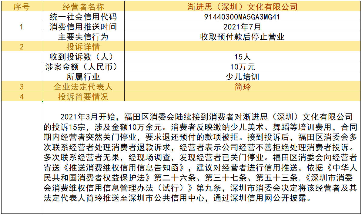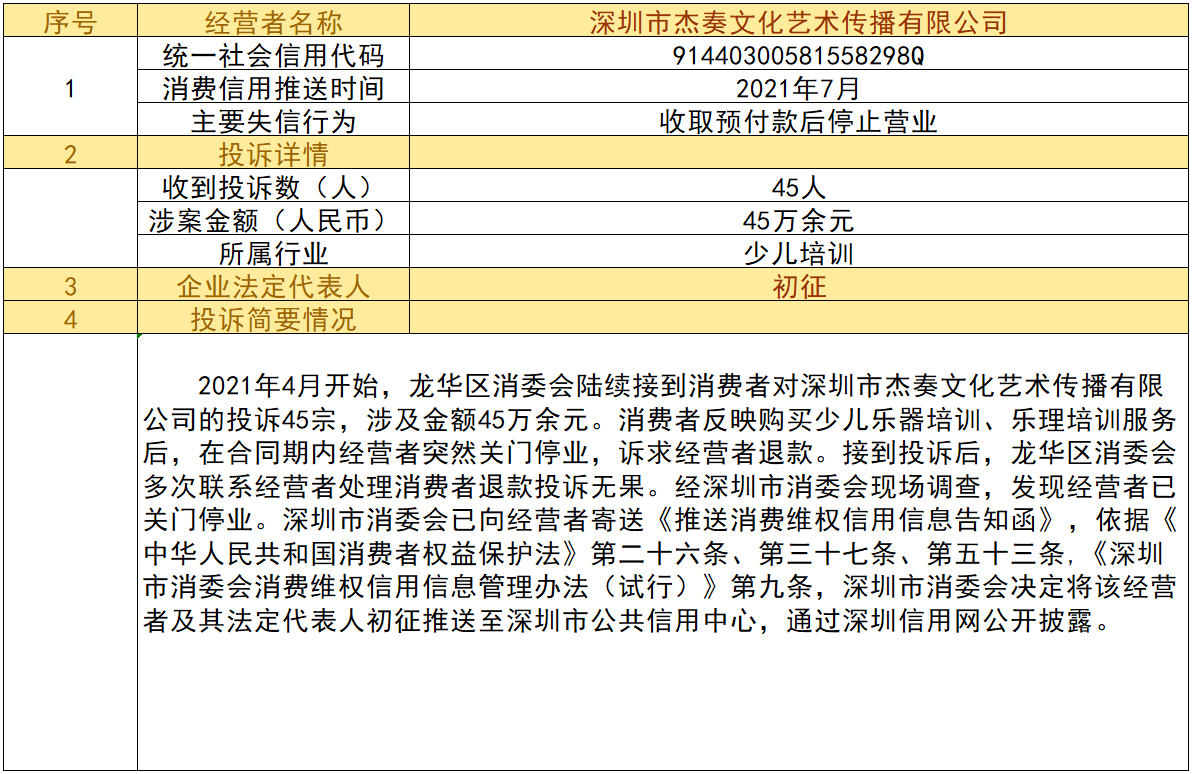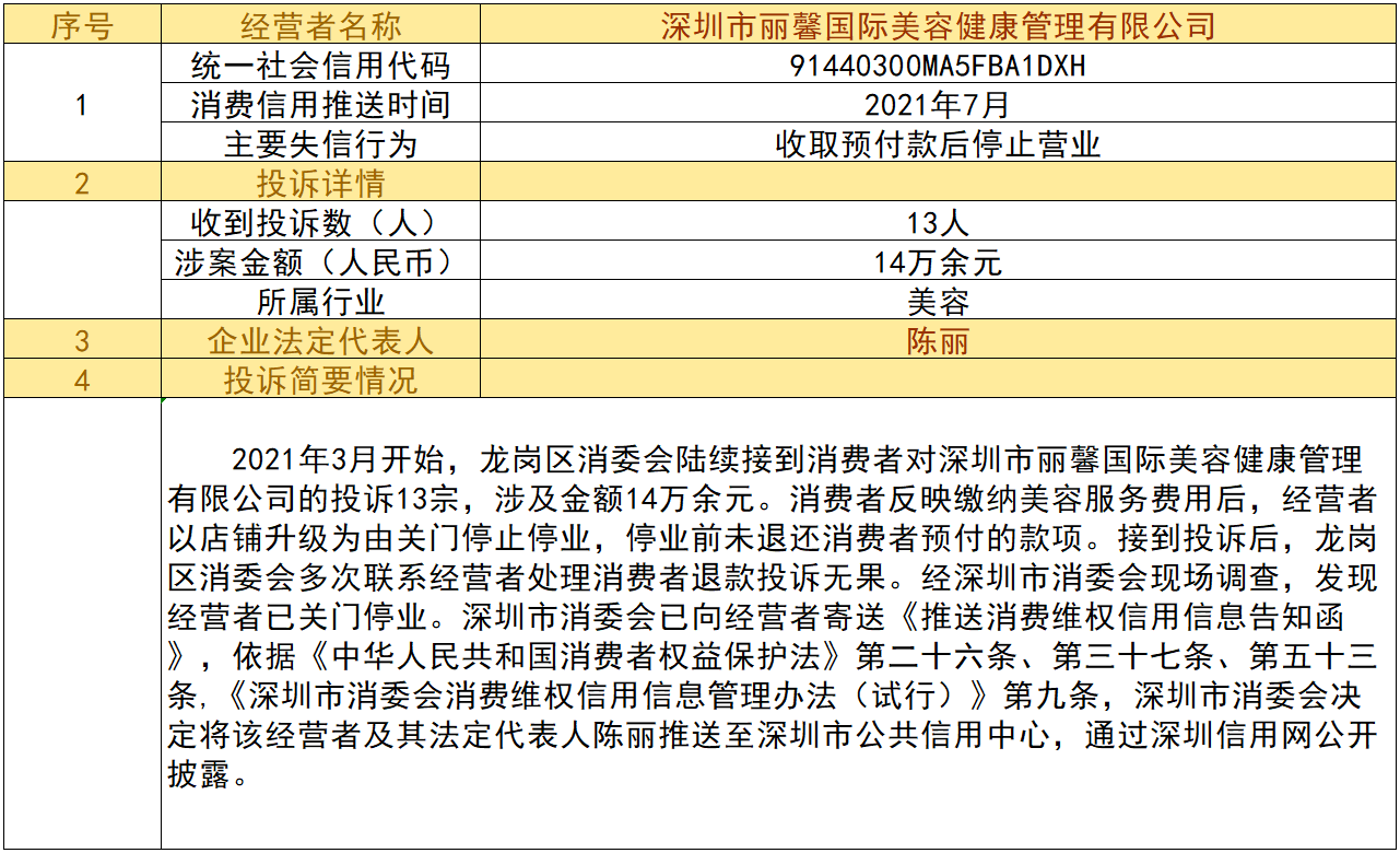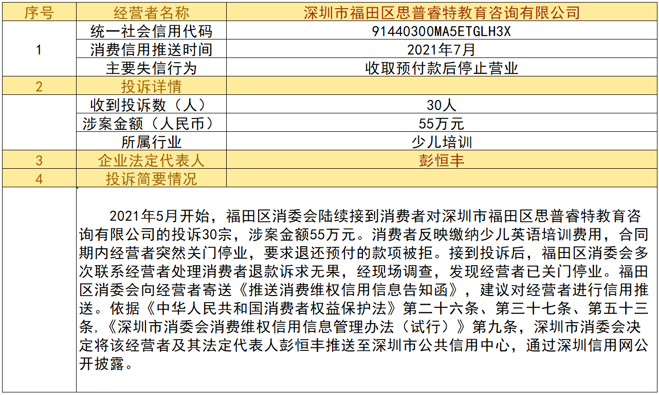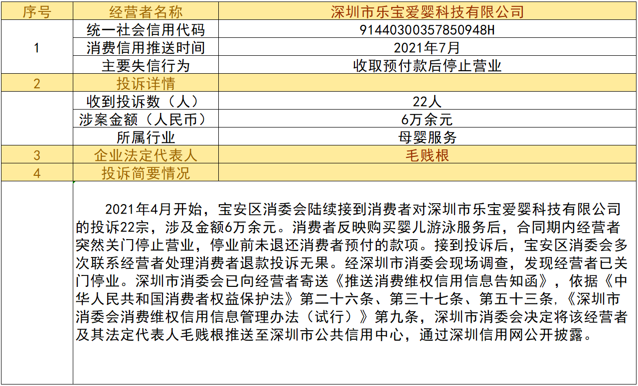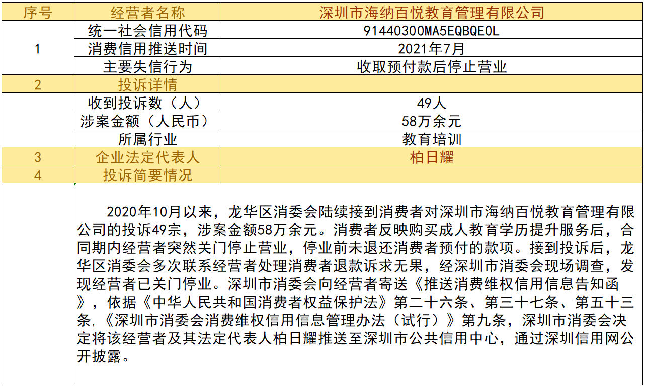 近日,深圳市消委會將九家“跑路”、未按約定退還消費者預(yù)付款項的經(jīng)營者及其主要負責人推送至深圳市公共信用中心,失信經(jīng)營者信息信息將通過深圳信用網(wǎng)公開披露。