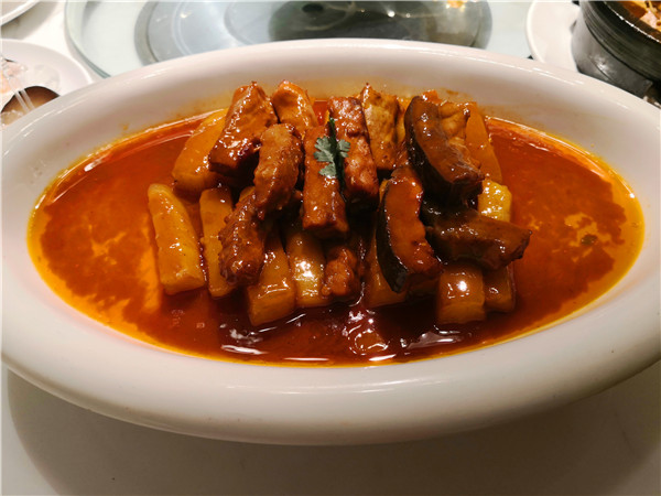 尤其扎眼的,正對(duì)大門(mén)的明廚亮灶上的幾塊牌匾,一下子就勾起人的食欲:老式熏豬手、手工燒老雞、烏蘇里江鰉魚(yú)、興凱湖大白魚(yú)、查干湖胖頭魚(yú)、火夫灶羊腿。這些都是地道的東北味啊!據(jù)介紹,老板湯長(zhǎng)明是黑龍江“龍菜”系傳承領(lǐng)軍人物,祖孫四代傳承東北菜廚藝,現(xiàn)在關(guān)東大院餐飲集團(tuán)董事長(zhǎng)。當(dāng)然,許多大家耳熟能詳?shù)拇蟊姴艘矐?yīng)有盡有,如:殺豬菜、小雞燉蘑菇、得莫利燉魚(yú)、大鵝燉寬粉、黑皮肘子、酸菜粉、地三鮮、東北鹵水點(diǎn)豆腐、金湯遼參、黃魚(yú)燒土豆、紅燒肉黃金勾......看得人口水直冒。加之,整個(gè)門(mén)店的布局也十分特別,一樓明廚亮灶之外,主要是大堂散座,周邊還有不少的書(shū)籍、酒架;二樓主要是包間,簡(jiǎn)潔明亮??梢哉f(shuō),在此可以感受到一股濃濃的關(guān)東風(fēng)情。