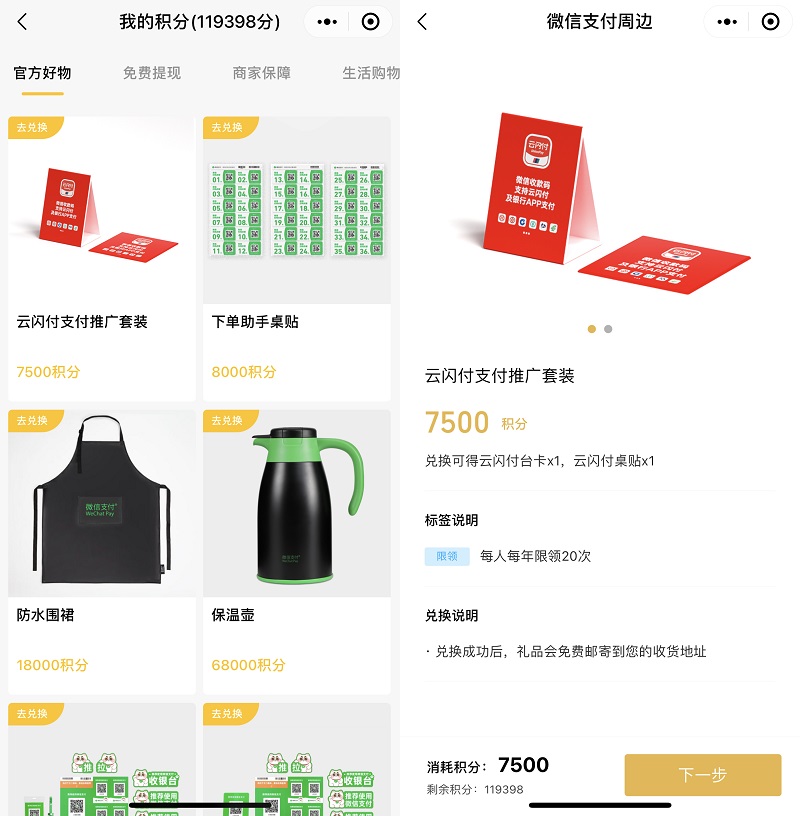 記者了解到,線下門店出現的宣傳物料是微信支付積極落實互聯互通的又一舉措,目前微信支付與銀聯云閃付 App已實現線下所有條碼的互認互掃,用戶可通過云閃付App直接掃描微信支付各類收款二維碼并完成付款。商家可在“收款小賬本”微信小程序,進入“我的積分”頁面,使用積分兌換“云閃付支付推廣套裝”,此外購買“微信官方收款碼”也可同時獲取云閃付相關物料。