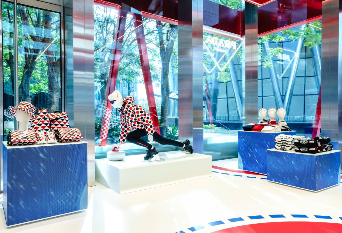 整個空間展售此獨特的Prada系列,包括單、雙滑雪板,雪橇,雪靴,滑雪鏡,雪靴袋和睡袋等運動配飾,以及風格別致的高性能服裝:科技面料打造的滑雪褲和百慕大短褲,飾以鮮艷幾何及花卉圖案的 Oversize聚酯纖維外套,疊印工藝平紋針織套裝,以及山嶺風情羊絨毛衣。