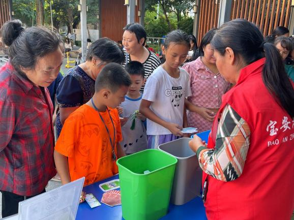 在換享留影區(qū)中,蒲公英講師開啟宣教的熱潮,向居民講解垃圾分類相關(guān)知識,派發(fā)垃圾分類宣傳折頁和《條例》手冊,引導(dǎo)居民從日常生活中細(xì)微開始,踐行源頭減量行動。