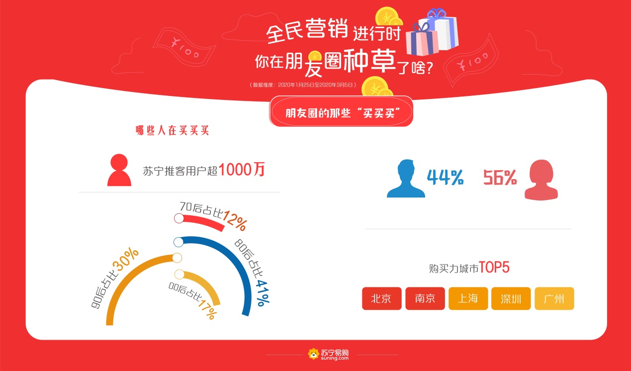 近日,蘇寧易購(gòu)發(fā)布全民營(yíng)銷大數(shù)據(jù),2020年1月25日至3月5日,蘇寧推客買家數(shù)和賣家數(shù)分別突破千萬(wàn)、百萬(wàn)大關(guān),80后成為朋友圈買、賣“雙主力”,糧油休食、個(gè)護(hù)家清、生鮮等產(chǎn)品成為最受歡迎的消費(fèi)品類。