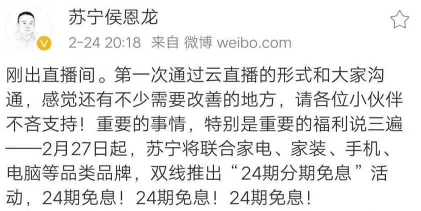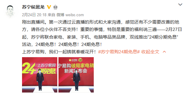 2月24日晚8點(diǎn),一場(chǎng)特殊的線上發(fā)布會(huì)在蘇寧矩陣直播平臺(tái)全面啟動(dòng)。蘇寧侯恩龍化身主播,宣布開(kāi)啟一場(chǎng)公司復(fù)工與市場(chǎng)復(fù)蘇的“救市”行動(dòng),拉開(kāi)家電銷售破局大幕。