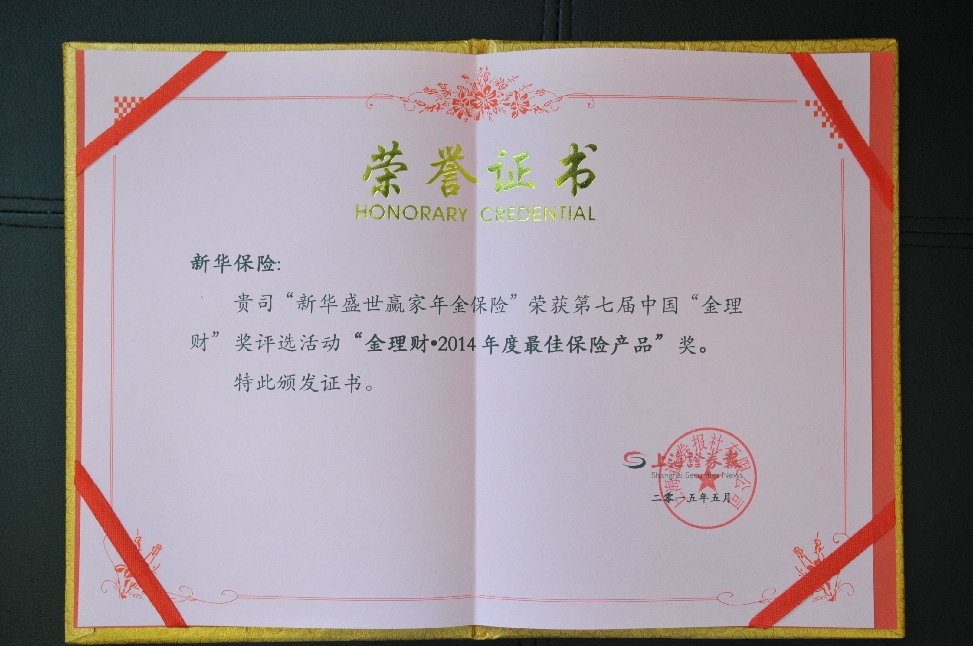2015年5月28日,上海證券報主辦的第七屆“金理財”獎頒獎典禮在上海舉行。經(jīng)專家評審團的嚴(yán)格評審、結(jié)合網(wǎng)絡(luò)投票和微信投票情況,在進行綜合評議后,“新華盛世贏家年金保險”榮膺最佳保險產(chǎn)品獎。