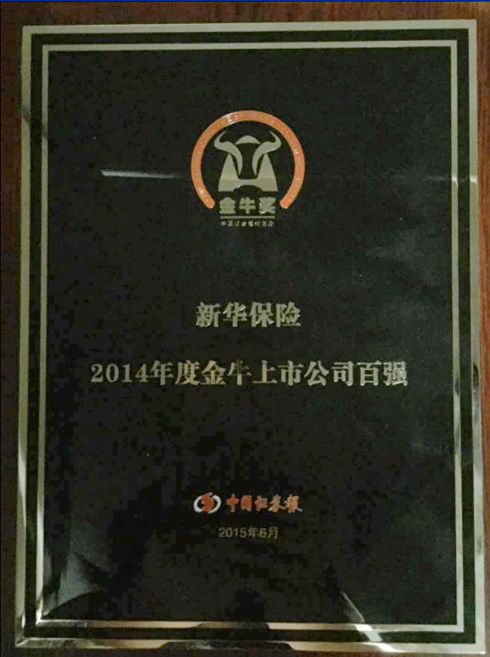 ?2015年6月,中國證券報第17屆(2014年度)上市公司金牛獎隆重揭曉,新華保險榮獲“金牛上市公司百強(qiáng)”獎項,這代表了資本市場以及社會各界對新華保險在公司治理、信息披露、投資者關(guān)系等方面工作的高度認(rèn)可。