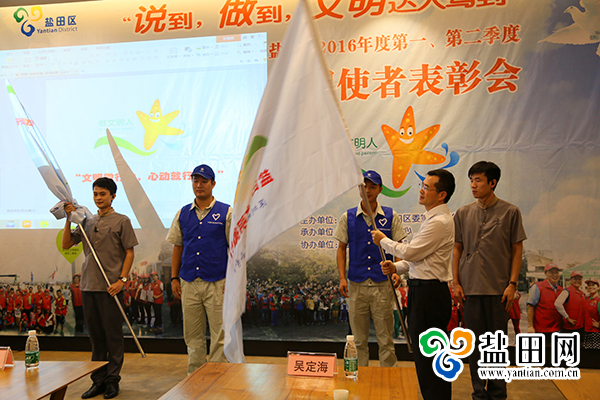 深圳新聞網(wǎng)訊(記者 鄧雪婷鄭創(chuàng)彬)8月18日下午,鹽田區(qū)“說到,做到,文明達人駕到”活動2016年第一、第二季度文明使者表彰會在鹽田紫禁書院舉行。姚軍、任秋芬、王茹洪、劉雪霞、黃東、劉曉紅、李廣慧、熊小云、鐘丹丹、羅少德10名文明使者榮獲表彰。區(qū)委常委、宣傳部部長吳定?,F(xiàn)場為文明使者頒獎,并為文明微行動深圳地鐵8號線小分隊授旗。