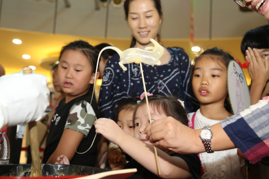 現場,糖人制作師傅安靜地坐在展臺前,任人群在身邊走走停停,埋頭專注捏著各式形狀。只見他用竹篾緩緩攪拌麥芽糖,挖出一團放在手里揉捏拉扯,做出一個小管子,抿嘴往里吹氣,麥芽糖慢慢膨脹并逐漸變成透明,再迅速捏出頭和腳,一只糖老鼠便活靈活現地被“吹”了出來?!疤衿媪耍溠刻窃谑迨迨种凶兂闪恕睢?,沒想到傳統手工藝如此出神入化。”10歲的玥玥瞧得津津有味,她說,比起逛商場和游樂場,這樣的體驗活動不僅能感受到中華傳統文化,還可以學到很多課本以外的知識。