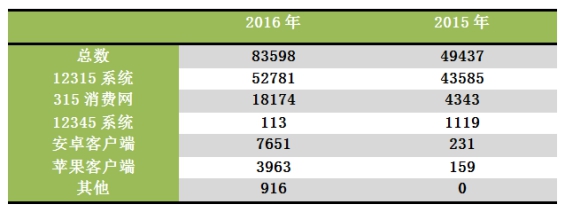 2016年,深圳市、區(qū)消委會共接受消費者投訴83598宗,比2015年的49437宗增長了69.10%,為消費者挽回損失2.1億元。其中,52781宗來源于12315系統,占63.13%;“315消費通”的網頁端、手機端、微信端已經成為另一消費者投訴主渠道,全年共接收消費者投訴30552宗,占36.55%,比去年的9.57%提高了27%。如表1所示。