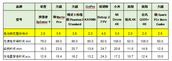 御Mavic Pro”和“精靈3標(biāo)準(zhǔn)版Phantom 3 Standard”,充電時(shí)間較短,續(xù)航時(shí)間較長,表現(xiàn)較好,獲評(píng)3.5分。