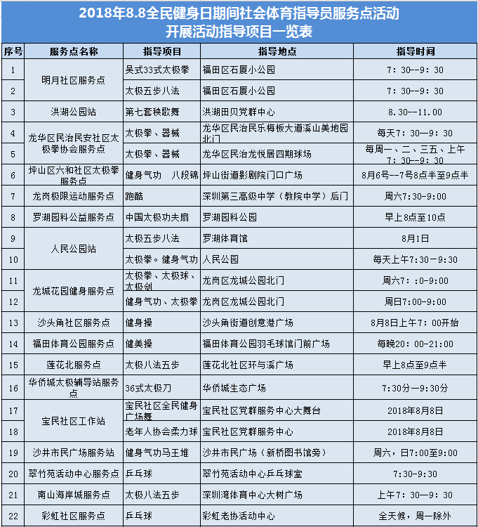 ????2018年8月8日,經(jīng)深圳市文體旅游局統(tǒng)計(jì),在“全民健身日”期間,深圳將有近50個(gè)全民健身站點(diǎn),為市民提供健身科普、大講堂、免費(fèi)咨詢(xún)及健身指導(dǎo)等,健身內(nèi)容涵蓋武術(shù)、舞蹈、健身操、球類(lèi)等眾多項(xiàng)目。