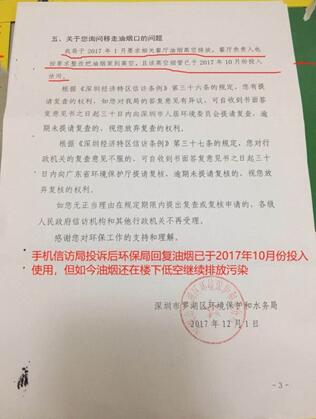 據(jù)悉,該市民在2017年已在信訪局上針對低層油煙管道對居民區(qū)排放油煙的問題進行投訴,當(dāng)年12月1日得到了深圳市羅湖區(qū)環(huán)境保護與水務(wù)局的回復(fù),稱羅湖區(qū)環(huán)水局已于2017年1月對相關(guān)低空排放油煙的餐廳提出了要將油煙高空排放的要求,餐廳安裝的高空煙管也已于2017年10月正式投入使用。