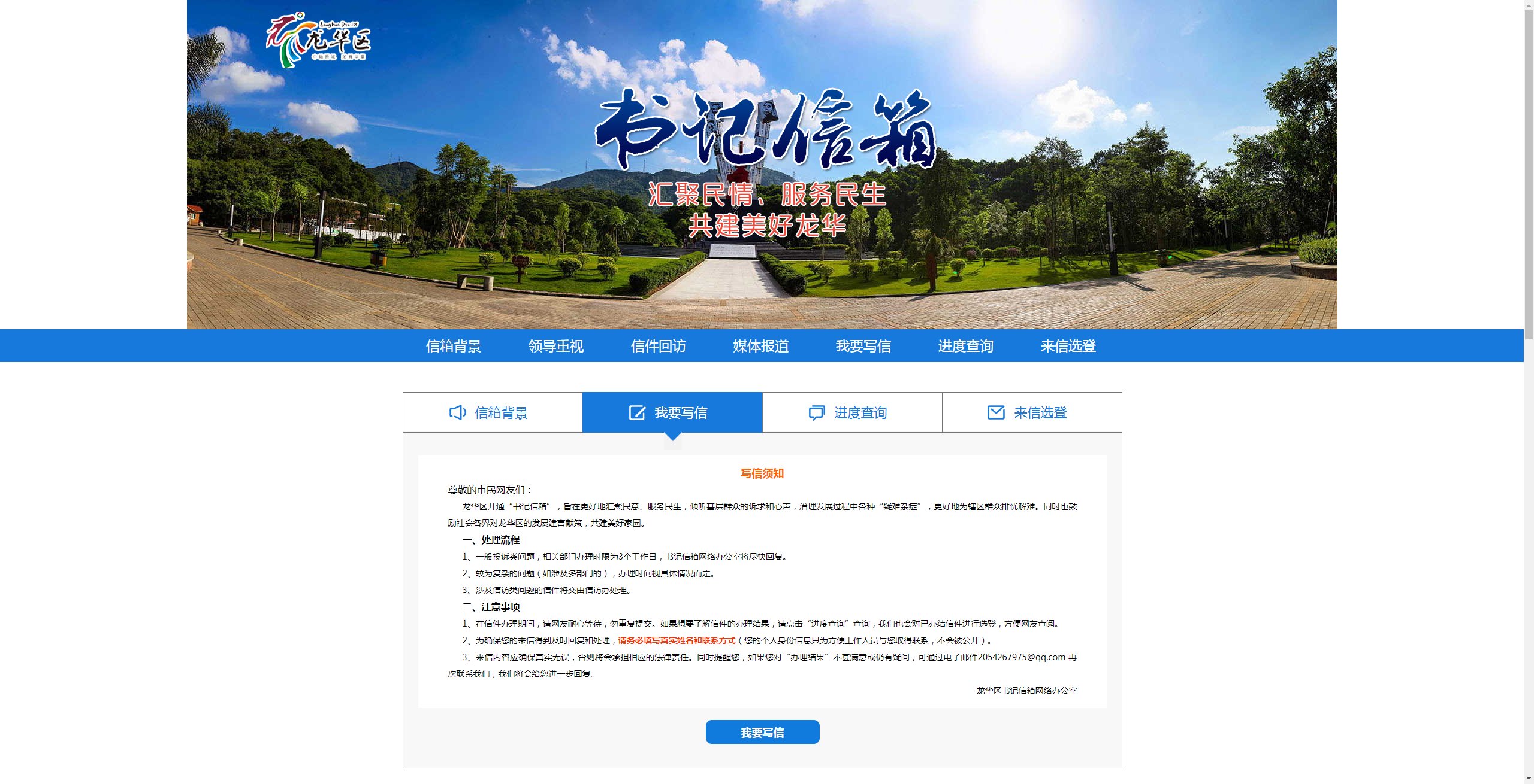 龍華區(qū)“書記信箱”網絡平臺是由龍華區(qū)領導的指導下搭建的網絡信息平臺,由深圳新聞網團隊進行開發(fā)搭建。“書記信箱”的構建,是龍華區(qū)委貫徹落實黨的群眾路線,踐行“三嚴三實”的一項新舉措?!皶浶畔洹弊?015年10月31日正式上線以來,逐步成為龍華市民向龍華區(qū)委反映、提出建議、意見和投訴請求的重要渠道。