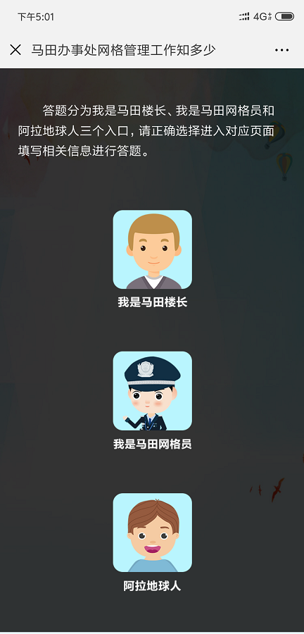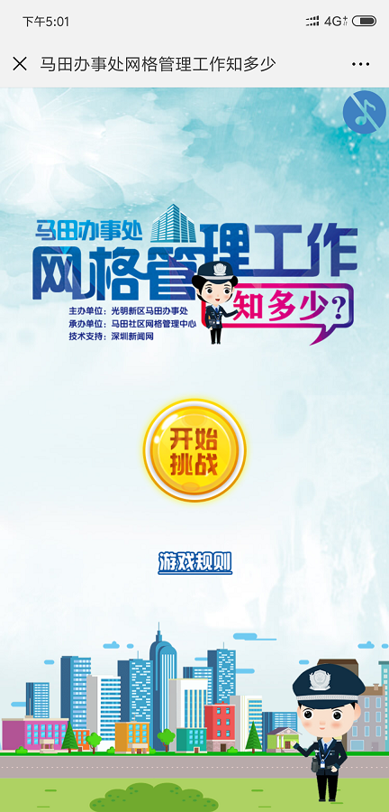 隨著當(dāng)前光明新區(qū)經(jīng)濟(jì)和社會的飛速發(fā)展,網(wǎng)格巡查管理工作環(huán)境日趨復(fù)雜。為此,馬田辦事處以社區(qū)網(wǎng)格化為抓手,積極帶領(lǐng)業(yè)主、樓長、住戶主動參與到樓棟的管理和社區(qū)的建設(shè),使他們從小“家”邁向大“家”,家家參與、人人行動,讓安全文明新風(fēng)形成常態(tài),營造生機(jī)勃勃、欣欣向榮的社會氛圍,在馬田轄區(qū)打造共建共治共享社會治理格局。“馬田辦事處網(wǎng)格管理工作知多少”線上有獎競答活動,由光明新區(qū)馬田辦事處主辦,馬田社區(qū)網(wǎng)格管理中心承辦。此次答題活動自8月15日9點(diǎn)啟動,截止至8月19日23點(diǎn)59分,為期5天。答題分為“我是網(wǎng)格員”入口、“我是樓長”入口和“阿拉地球人”三個(gè)入口。通過樓長入口進(jìn)入的用戶,需輸入馬田轄區(qū)樓長身份證或港澳通行證號方可答題,網(wǎng)格員入口則需輸入馬田轄區(qū)網(wǎng)格員有效證件號碼進(jìn)入對應(yīng)的答題頁面。在每次答題時(shí),答題系統(tǒng)將隨機(jī)抽取10道題,用戶須在120秒的時(shí)間內(nèi)完成,答對8題以上即視為闖關(guān)成功,可獲得一次抽獎機(jī)會,有機(jī)會獲得100元、50元、10元、5元、2元不等的微信紅包。