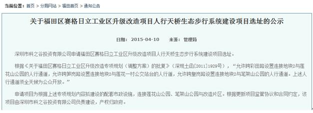 而據(jù)資料記載,市規(guī)土委曾經(jīng)在2015年4月10日,在福田管理局官網(wǎng)上發(fā)布了《關于福田區(qū)賽格日立工業(yè)區(qū)升級改造項目人行天橋生態(tài)步行系統(tǒng)建設項目選址的公示》,其中明確提到“根據(jù)《關于福田區(qū)賽格日立工業(yè)區(qū)升級改造專項規(guī)劃(調整方案)的批復》(深規(guī)土函[2011]1929號),‘允許跨彩田路設置連接地塊2與蓮花山公園的人行通道,允許跨筍崗路設置連接地塊2與蓮花一村公交站臺的人行道,允許跨皇崗路設置連接地塊2與筆架山公園的人行通道。上述人行通道須全天候為公眾開放’?!?/p>