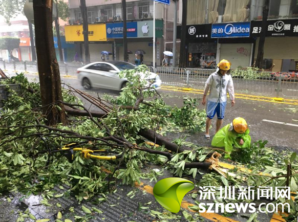 9月16日上午,蛇口街道南水社區(qū)黨委書記、婦聯(lián)主席李淑文,冒著可能被樹倒塌木砸傷的危險(xiǎn),浸泡在沒膝的雨水中幾個(gè)小時(shí)清理臺風(fēng)刮落路面的樹枝,讓來往車輛順利通行。