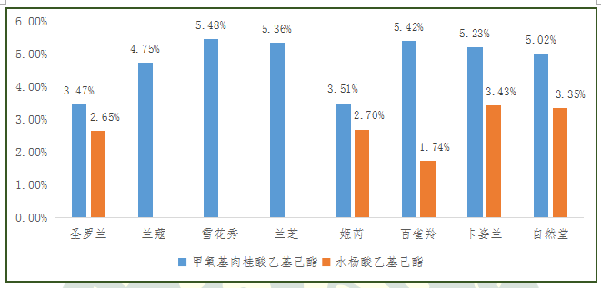 本次測評的8款氣墊粉底有5款屬于防曬類化妝品,3款屬于非防曬類化妝品,均檢出了一定量的化學防曬劑。檢測結果顯示:8款氣墊粉底均未檢出禁用的化學防曬劑,允許使用的檢出值均在最嚴格的限量范圍之內,并且化學防曬劑成分與批件及標簽標識一致,不僅符合國家標準要求,也符合美國標準要求。