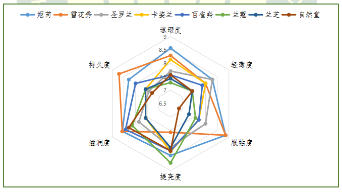 獲得本次感官評價指標綜合得分前三名的品牌為:姬芮、雪花秀和圣羅蘭,得分分別為:8.44、8.22和7.91。8款產品在感官評價中均達到優(yōu)良水平以上。