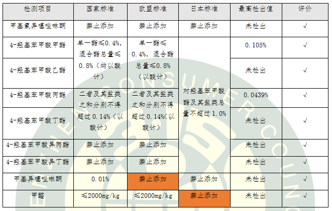 5.其它禁用物質:氫醌、苯酚和甲醇在8款產品中均未檢出,符合國家標準要求。