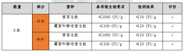 檢測結果顯示:8款氣墊粉底的粉撲和料體的菌落總數(shù)、霉菌和酵母菌總數(shù)檢出量均低于10 CFU/g,遠低于產品微生物的標準要求限值,屬于安全范圍,消費者無需過度擔心。